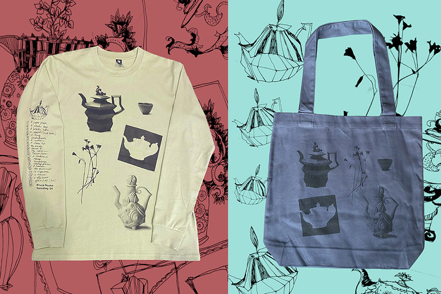 To celebrate our Parnati season exhibitions, Samstag has collaborated with local designer Tyrone Ormsby to create unique shirts and totes inspired by the ceramic works and artist journals of Bruce Nuske.