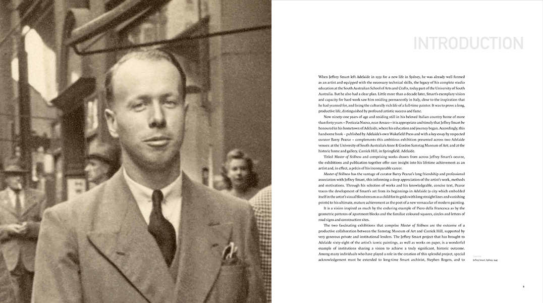 Master of Stillness: Jeffrey Smart paintings 1940–2011 has been published to coincide with the twenty-first anniversary of absorption by the University of South Australia of the South Australian School of Art from which Smart is considered perhaps its greatest alumnus. In recognition of this, the University bestowed on him an honorary doctorate in 2011 and organised a retrospective through the Samstag Museum of Art, with works from the Adelaide period shown at Carrick Hill.