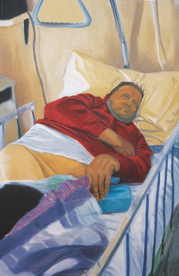 Inert in his metallic cot, Karl has the lolling bulk of a hospitalised odalisque. Apart from his distracted eyes, he's as factually banal as a cadaver. But in those eyes Derrick assigns the outward register of inner anxiety. We know this man to be of the tribe whose diurnal hours are absorbed, in the artist's words, by slow regimes of 'sleeping, eating, smoking and fighting with personal demons.'