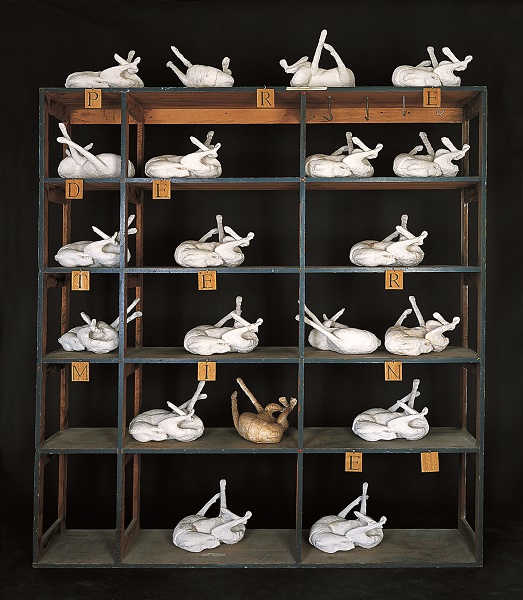 Past Tense / Future Tense recasts the suffocated Pompeii dog in multiples of prototypical death, a frequent condition of Holland's animals. These dead dogs, museologically sorted, shelved and classified, illustrate the canon of empirical separation.