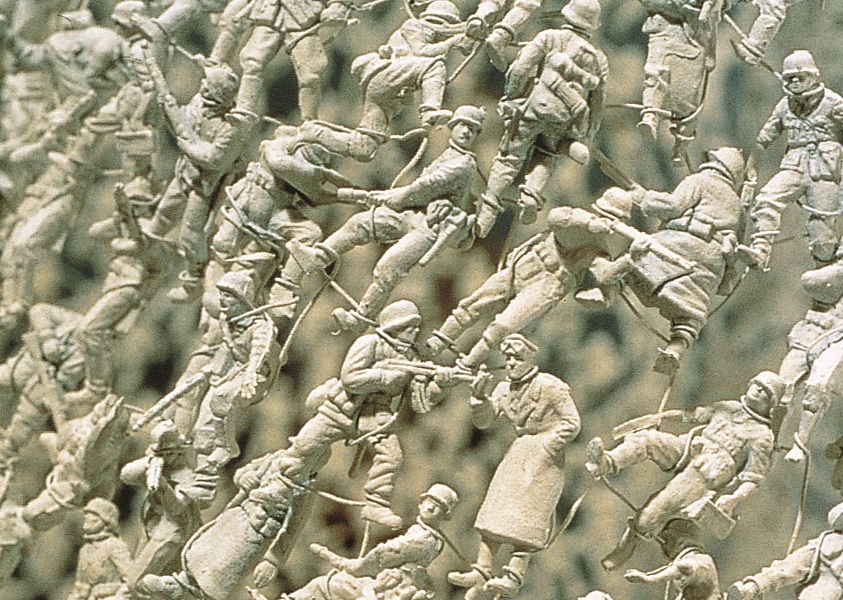 Clothes are the means by which culture wraps the body: this interface is the site of the work of Christine Collins. In White Lies she has fashioned the vestments of high office (cloak and crown) out of miniature plastic toy soldiers. The disjunction between the larger picture and the detail makes the point: underlying the beauty, stature and magnificence of the powerful figurehead is warfare, and death for many.