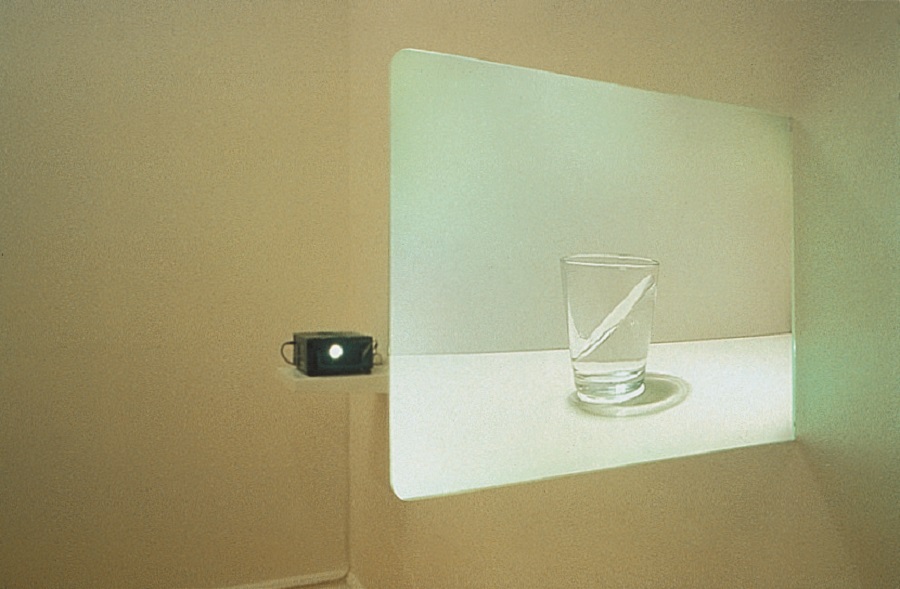 The other element of von Sturmer's practice is video, a medium seemingly incompatible with these spatial interventions. Science Fiction features a loop of five 'tricks', simple gags mostly done by running the video backwards – a blob of plasticine 'miraculously' regains its cuboid shape; a blob of blu–tac leaps up to attach itself to a fingertip; the surface of the water in a glass tilts weirdly sideways as in a force field. Projected onto a wall–mounted perspex screen, the video's studio backgrounds blend into the gallery surroundings so that these little stunts become dematerialised presences within the gallery itself, 'works of art' in the obvious, slightly silly sense. Their tricksiness, then, wittily calls attention to the privileges of the exhibition space, where, temporarily, the rules (in this case, of physics) do not apply.