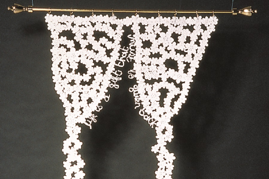 Using a traditional craft technique called quilling, the work Curtain was made from paper death shrouds that cover bodies in transport from hospital to the funeral home or mortuary. Hodgeman's use of craft practices – time–consuming and process–oriented, involving repetitive actions – is part of her own gift-giving in this work. It honours the obligations of the subject's gravity – the weight of responsibility involved in dealing with other people's stories.