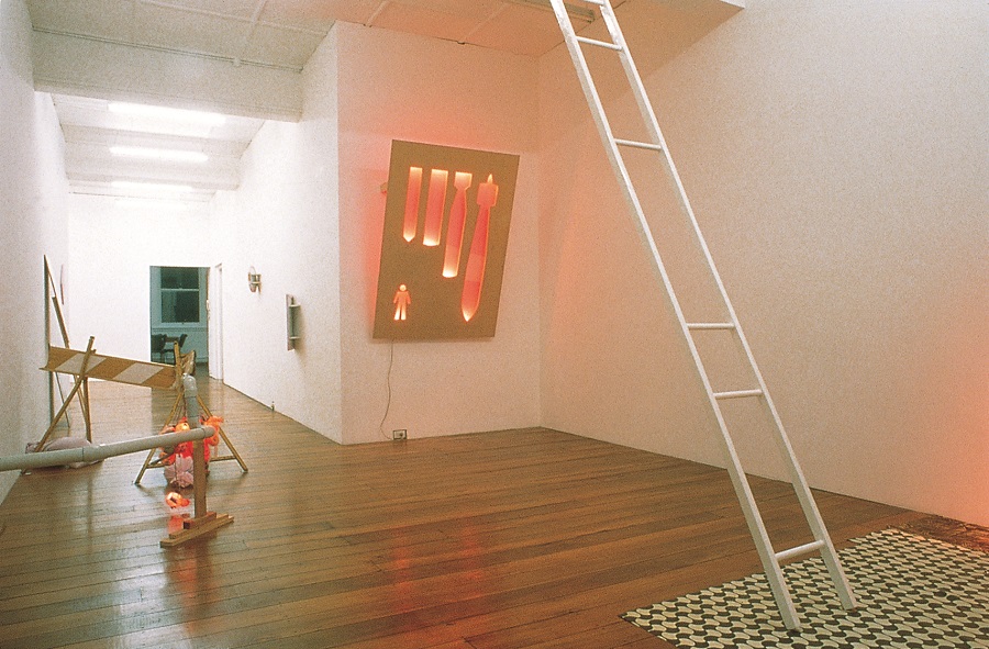 In Detour the choice of materials is the magneto firing the conceptual idea behind the work. A ladder with missing rungs stretches from floor to ceiling, a length of white pvc plumbing pipe sprouts a dangerous bouquet of electrical wiring, feeding bulbs made from the bodies of plastic toys, the synthetic colours emanating a noxious sickly glow. Nearby a striped road barrier is propped a–kilter. Reflecting on the construction of the individual within a conformist social system, the structures which attempt to corral, direct and monitor our progress (the ladders, the barriers, the lit ways) are rendered dysfunctional. With wires exposed, the sinister aspect of the circuitry or system is revealed: shoddy facture and questionable ends.