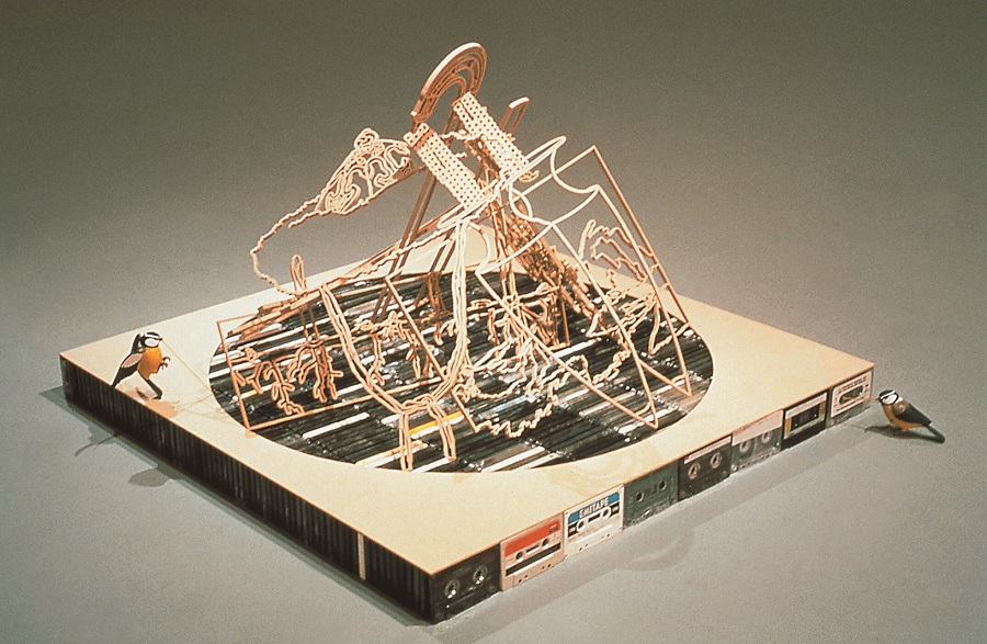 Bomb presented a kind of rebus–complete with surrogate viewer: the puzzling birds, two of them, that play at unravelling the piece's unspooling cassette–tape ribbon, mimic an involvement that stands for ours and serves to induce it. The large cube (Not yet titled, 1) functions–as did Sol LeWitt's gridded sculptural permutations–to have our rational conception explain and inform our sensory inventory of the object and its identification or certification as grid, cube or whatever. (We see it when we believe it.) Sterling's pieces, though, through their fragility and transparency, require constant re–verification: gleams and reflections, temporary invisibilities or transparency, render them permanently unstable, evanescent. Around and through this impasse and engagement a wider cloud of thought and feeling bleeds in.