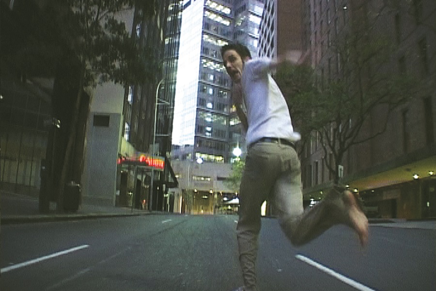 Moore's Dead Zone videos, which the viewer sees, one on his or her left, the other on the right, show a figure running, staggering through a city. Empty streets presumably shot in the early morning. The figure is barefooted and stumbles repeatedly, always nearly loosing balance, and turns regularly to look over his shoulder at his (implied) pursuer. One video follows his progress, effectively constituting the pursuing point of view. The other would have been filmed retreating before the staggering runner: but is projected in reverse, so that the figure retreats and the oddness of his gait gains a vulnerable, awkward grace and the viewer gains a great intimacy with it, noting characteristic strengths and flexibility, the slightness of the figure and the dance–like quality of the movements.