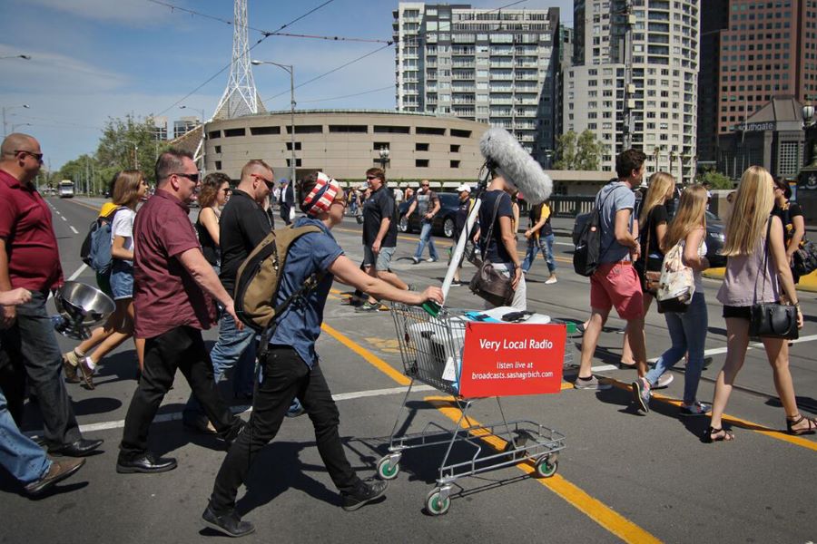 In Very Local Radio (2014, 2015) the artist navigated city streets, pushing a shopping trolley loaded with sound recording gear and an internet radio transmitter. The sensorial focus of her urban exploration was shifted from the ocular to the auditory, seeking out unique ecologies of sound that were then broadcast online. Deprived of visual data, listeners had to assemble an understanding of the city through their ears. This process also allowed Grbich to meet and engage with the diverse communities that inhabit these spaces—including a group of parkour traceurs, kids, retirees, and people experiencing homelessness—sometimes handing over the microphone to allow the community to speak for itself.
