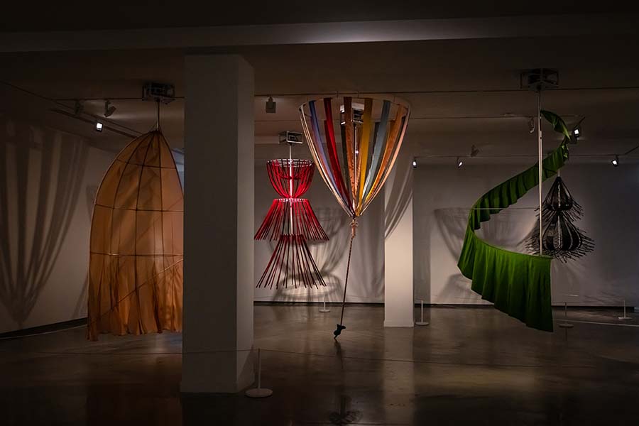 While savouring the quiet solitude of stitching, Gartside also relished researching to produce her kinetic installation Loie, Artemisia, Pixie, Sarah, Lilith (2021). This extraordinary femmage honouring the strength and talent of five women forebears was commissioned for Primavera 2021 at the Museum of Contemporary Art. Luscious velvets, silks, and satins—sewn onto suspended spinning steel armatures—metamorphosise into painter, actor, dancer, spiritualist and the demonic female. Whirling, fluttering and twisting in hypnotic autonomous software-controlled sequences, these fabrications exude a radiant sovereignty.
