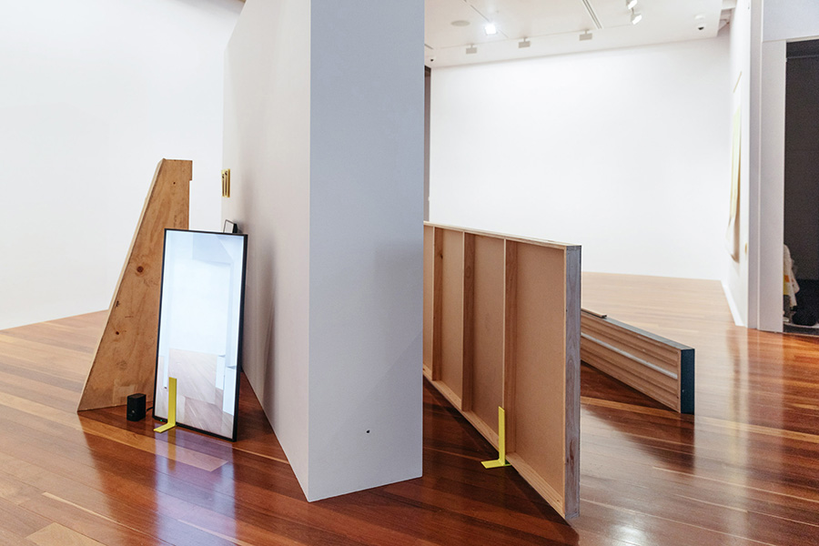 SET AND DRIFT (3-4 constellations for Samstag Museum of Art) (2020), recalls the bodily experience of virtual reality realms, where a work is only activated by the viewer's presence. Disparate and disassembled objects—fire extinguishers, half-unboxed screens, safety tape, barricades caressing empty gallery walls—suggest a sophisticated puzzle. There is a faint awareness that, just as in gamespace, we are being directed by subtle prompts along predestined pathways to encounter a succession of perspectives.